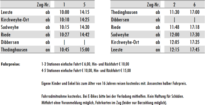 Die Stationen Bremen-Kirchhuchting, Moordeich, Stuhr, Brinkum und Erichshof können voraussichtlich erst wieder ab 2027 angefahren werden, weil dort die Verlängerung der Straßenbahn von Bremen nach Leeste gebaut wird. Dennoch freuen wir uns darüber, denn vor über 25 Jahren haben wir gegen die drohende Stilllegung unserer Kleinbahn und für den Bau der Straßenbahn gekämpft. Und wir sind stolz, dass es nun endlich so weit ist und die Kleinbahn Bremen - Thedinghausen weiterlebt!
